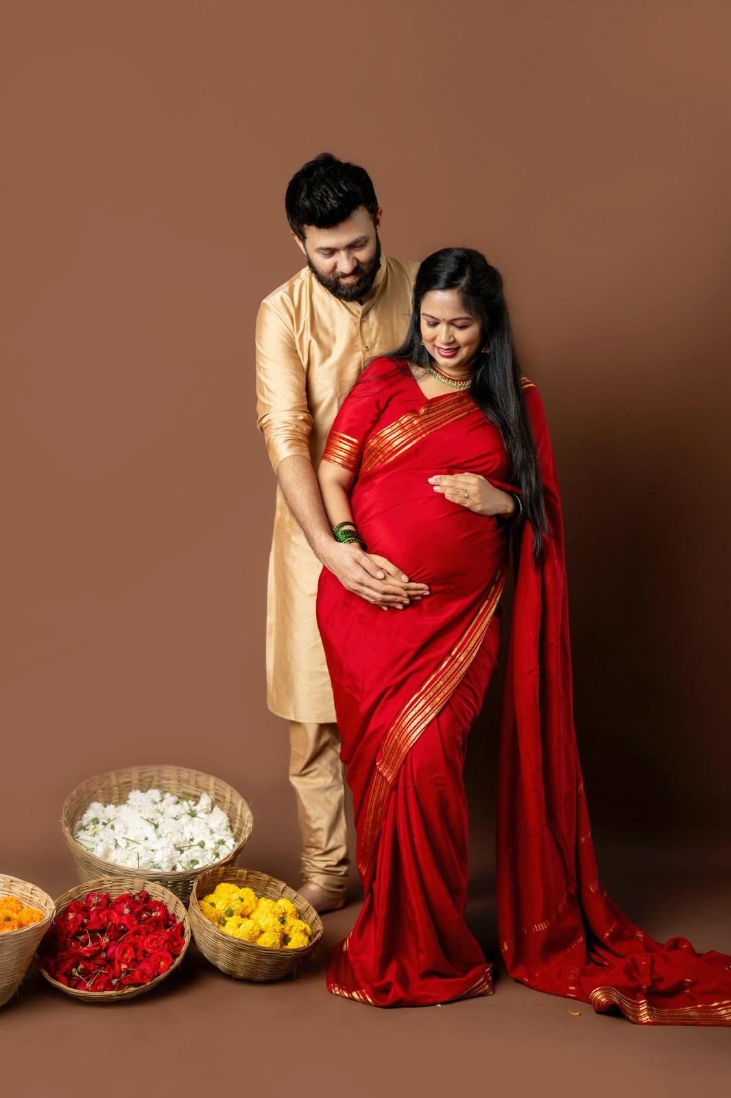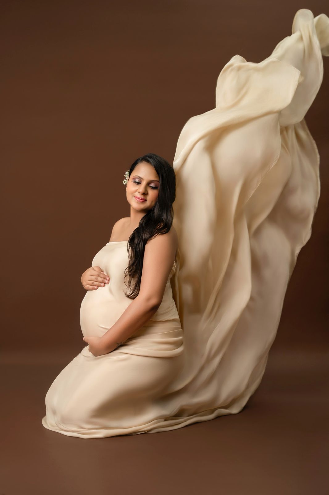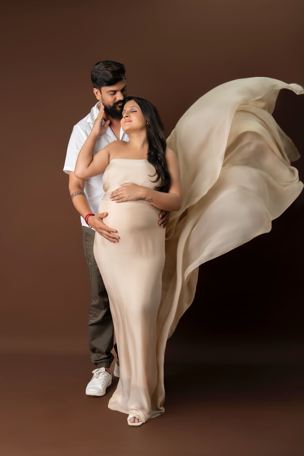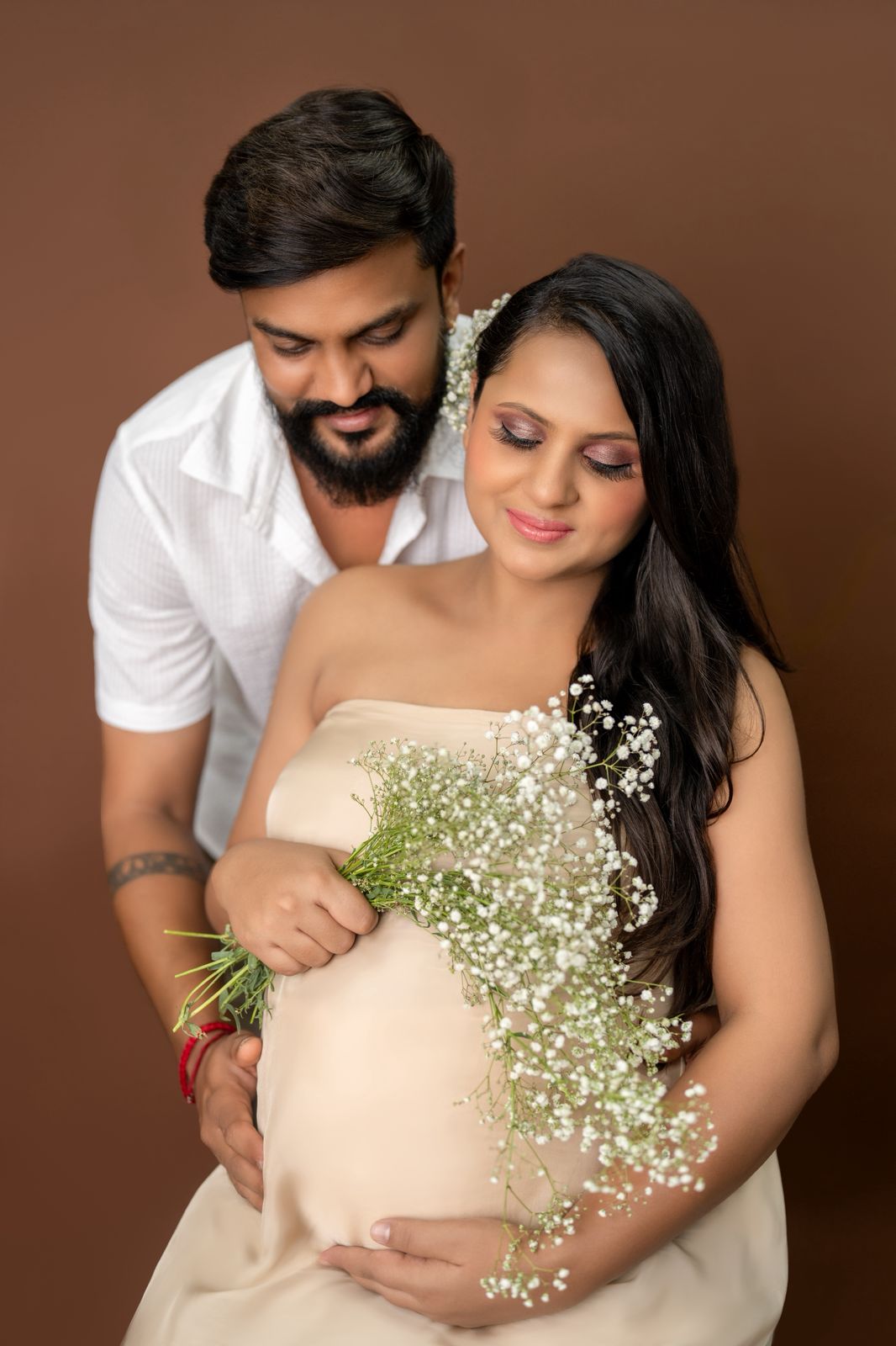 Ideally, maternity photoshoots are scheduled toward the end of the second trimester or early in the third trimester (Wk 27 to 31), when the baby bump is prominent, but the mother is still comfortable with posing.